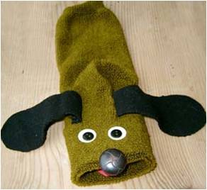 5. Вырежьте из плотной розовой ткани язычок и приклейте его в рот собачки. Язык не должен выглядывать, когда рот куклы закрыт