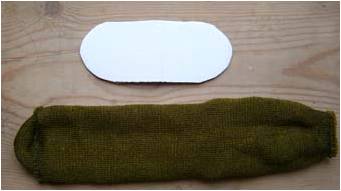 1. Вырежьте из картона овал как на фото. Выверните носок наизнанку и разложите так, чтобы пятка была внизу