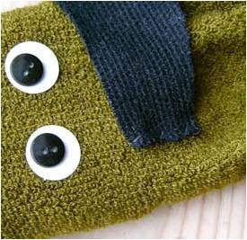 4. Пришейте нос-пуговицу. Глаза мы приклеили на клей. Можно их сделать из белой и черной пуговицы или из готовых глазок, их можно также нарисовать на картоне